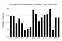 A graph of the cases of brucellosis in humans in the United States from the years 1993–2010 surveyed by the Centers for Disease Control and Prevention through the National Notifiable Diseases Surveillance System[9]