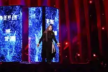 The Maltese performance featured Christabelle wearing a tight black long sleeved turtle neck and a black leather skirt with an uneven hemline, and performing together with one dancer. The performance began with Christabelle standing in the centre of a cube prop with four diagonal double-sided screens, displaying videos of people in a box, with an augmented reality heart appearing over her chest and a globe image appearing during the first verse. In the second verse, Christabelle came out of the cube for the dancer to take her place for the remainder of the performance. The performance also utilised lasers and pyrotechnics.[12][13] Christabelle was joined by four off-stage backing vocalists: Anna Azzopardi, Josef Tabone, Pamela Bezzina and Petra Zammit. The dancer featured during the performance was Anthea Zammit who previously represented Malta at the Eurovision Young Dancers 2015.[14][15]