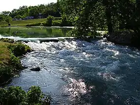 The Mammoth Spring outlet at normal flow stage. Pictured from the east looking westwardly.