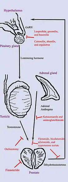 Hormonal therapy for prostate cancer targets the pathways the body uses to produce DHT. A feedback loop involving the testicles, the hypothalamus, and the pituitary, adrenal, and prostate glands controls the blood levels of DHT. First, low blood levels of DHT stimulate the hypothalamus to produce gonadotropin-releasing hormone (GnRH). GnRH then stimulates the pituitary gland to produce luteinizing hormone (LH), and LH stimulates the testicles to produce testosterone. Finally, testosterone from the testicles and dehydroepiandrosterone from the adrenal glands stimulate the prostate to produce more DHT. Hormonal therapy can decrease levels of DHT by interrupting this pathway at any point. There are several forms of hormonal therapy: