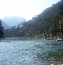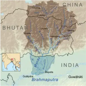 The Manas River (pron: [ˈmʌnəs]), known in Bhutan as the Drangme Chhu, is a transboundary river in the Himalayan foothills between southern Bhutan, India, and China. It is the largest of Bhutan's four major river systems,[1] with the other three being the Amo Chu or Torsa River, the Wang Chu or Raidak, and the Puna Tshang Chu or Sankosh. It is met by three other major streams before it again debouches into India in western Assam. The river flows for a total length of 400 kilometres (250 mi), including through Tibet for 24 km (15 mi), Bhutan for 272 kilometres (169 mi), and Assam for 104 kilometres (65 mi) before it joins the mighty Brahmaputra River at Jogighopa. A major tributary of the Manas, the Aie River, joins it in Assam at Bangpari.[2][3]