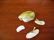 Fat is extracted from dried mango kernels by hydraulic pressure,[2] or by solvent extraction.[3] In solvent extraction, hexane, a liquid hydrocarbon, is used as the extraction medium. The collected mango stones are washed with well-water soon after collection. After washing, the seeds are sun-dried to reduce the moisture content to 12-15%. The dried seed stone is roasted in a drum roaster and the hull is removed mechanically, or manually by beating with wooden clubs. The separated kernels are crushed into small pieces in a hammer mill. The mango kernel pieces are conveyed to a pellet making machine and pellets are formed. The pellets are cooled to room temperature in a cooler and are conveyed to the solvent extraction plant. Some processors produce flakes by crushing the seeds in a flaking roller mill.[4]