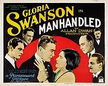 Manhandled is a 1924 American silent drama film directed by Allan Dwan and starring Gloria Swanson. The film was produced by Famous Players–Lasky at their East Coast Astoria Studios facility and distributed by Paramount Pictures. The supporting cast includes Frank Morgan.[1] A young woman goes out partying when her hard-working boyfriend neglects her.