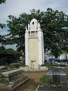 The Bautista-Nakpil Pylon at the North Cemetery was designed by Juan Nakpil as a tribute to both Bautista and Nakpil families, including his uncle and benefactor, Dr. Ariston Bautista. The funerary pylon is a tall, square podium which has four human figures on the top corners that form a gesture of prayer capping off the tall columns. The frontal side is embellished by geometricized flowers, spiraling foliage, and nautilus shells in low-relief concrete panels which has a highly decorated stoup on the lower portion.[8] An octagonal lantern-like form sits on top of the podium with miniature columns buttressing on all sides and crowned by a rigid dome.