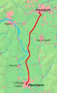 Mannheim–Frankfurt railway is a German standard gauge, electrified railway line and runs in southern Hesse and northern Baden-Württemberg between Frankfurt and Mannheim. It is also called the Riedbahn (Ried Railway). The line runs through an area called the Hessische Ried, hence the name. The term Riedbahn was originally used for the Darmstadt–Worms railway and the two lines share the central section between Groß-Gerau and Biblis.