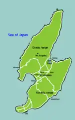 The island consists of two parallel mountain ranges running roughly southwest–northeast, enclosing a central plain. The Ōsado (大佐渡) range, in the north, is slightly higher, with peaks of Mount Kinpoku (金北山), the highest point of the island at 1,172 metres (3,845 ft), Mount Kongō, Mount Myōken, and Mount Donden. Kosado (小佐渡) range in the south faces the Honshu coast. The highest point in Kosado is Ōjiyama (大地山) at 645 m.