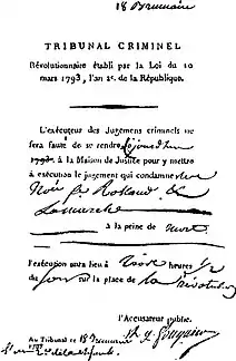 - ↑ It is not clear whether Madame Roland was called as a witness during the trial against the Girondins. She was present in the building where the trial took place. However, the judge ruled at a certain point that the case had been going on long enough "because the accused had already been found guilty by the people."