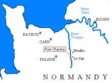 Robert's family were lords of the manor of Pont-Chardon ("Chardon Bridge", literally "Thistle[4] Bridge") (modern Pontchardon) in Calvados, Normandy, situated on the River Touques. His name was Latinized to de Ponte Cardonis or de Ponte Carduno[5] ("from the bridge of Cardon"). Robert de Pont-Chardon was certainly well rewarded for his companionship and support by Baldwin FitzGilbert (died 1090), Sheriff of Devon, and feudal baron of Okehampton (alias Baldwin de Meulles and Baldwin du Sap), tenant-in-chief of 176 manors in Devon, who granted him lands in England amounting to four and a quarter knight's fees. Baldwin's chief seats in Normandy were Meulles and Le Sap, from which he took his alternative surnames, which were located 7 kilometers north-east and 7 kilometers south-east of Pont-Chardon respectively. The lands granted to Robert were chiefly in Devon, Somerset, Hertfordshire and a manor in Hampshire. His Devon estates comprised the following five manors, all in North Devon and all held from Baldwin the Sheriff (whose follower he thus may have been):