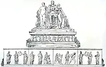 When he published the discovery, Fougères suggested that the three plaques decorated the sides of a rectangular pedestal and suggested that they be associated with a passage of Pausanias who mentions in his description of Mantineia, "a sanctuary of Leto and her children; it was Praxiteles who made the statues, two generations after Alcamenes; on their base there are carvings of a Muse and a Marsyas playing the aulos."[6]