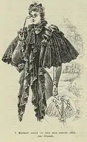 A variation on the mantle is the mantelet (also spelled mantelot and mantlet), typically describing a short version of the mantle. The term appears as early as 1386, in "The Knight's Tale" by Geoffrey Chaucer. In the 18th century, a mantelet was a woman's short cloak, and in the early 19th century, it was an ornamental scarf that crossed over the chest and tied behind, usually made of fur or lace.[1] By the end of the 19th century, a mantelet was a woman's shoulder cape with elongated ends in front, sometimes held in position by a belt at the waist.[1]