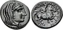 Veiled head of Manto (left) and a Thessalian horse rider inscribed on a 3rd-2nd century coin (right)