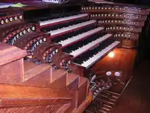 The organ console in St. Mary Redcliffe church in Bristol, England, with four manuals.
