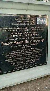 1. 1 2 3 4 5 "Presidentes de El Salvador – Doctor Manuel Enrique Araujo" [Presidents of El Salvador – Doctor Manuel Enrique Araujo]. Government of El Salvador (in Spanish). Archived from the original on 8 April 2009. Retrieved 2 October 2021.