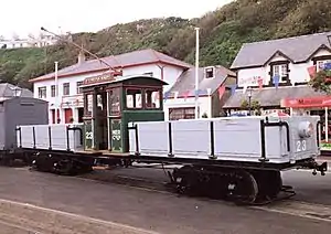 Constructed by the railway company in 1900, and later rebuilt with wagon bodies on either side, the locomotive is now privately owned. It was restored in 1983 and operated as part of the centenary and subsequent celebrations, painted in the "Isle of Man Tramways & Electric Power Co. Ltd." livery. In 1993 the vehicle was named "Dr R. Preston Hendry" in recognition of the man who did so much to save the railways of the island at a difficult time.