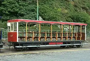 a Brill-Stephenson 1907 bogie car in that city’s unusual track gauge of 900 mm (2 ft 11+716 in), bought for conversion to Manx Electric Railway’s almost identical 3 ft (914 mm) gauge, — conversion never implemented due to clearance difficulties; it was used as a passenger waiting shelter for a spell; vehicle now in off-site storage on the island.[1]