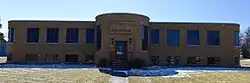 Building #7, as it was known, is a single-story, brick structure, with a full basement. The building was locally designed and constructed by employees of the Maquoketa Company in the Moderne style. This is the only building in the county that was built in this style.[2] It features simple lines, shapes, and planar surfaces. Both the main entryway on the north side of the building and its corners are rounded. The building sits on a 5-acre (2.0 ha) lot, and is fronted by a park-like setting, which is how the building was always situated. The factory sat immediately behind it. In the 1950s the property was planted with evergreen trees, shrubs, and flowers. They were removed over the years.