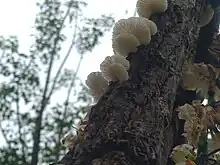 | Basidiocarps of Marasmiellus inoderma on a banana pseudostem | |