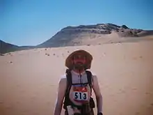 The marathon was the brainchild of French concert promoter Patrick Bauer who in 1984 traversed the Sahara desert on foot and alone.[4][5][6][7] He covered 350 km (214 mi) in 12 days without encountering a single oasis or desert community along the way. Two years later in 1986 the first Marathon des Sables was run. Twenty-three runners participated in the race with Bernard Gaudin and Christiane Plumere, both of France, finishing as the winning man and woman.