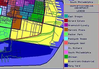 In 2002, the City of Philadelphia legislated boundaries of the Sports Complex Special Service District. The residential communities defined included Marconi Plaza. The Special District established an overlay providing the basis for a new definition to Marconi East as community 3 and Marconi West as community 4.