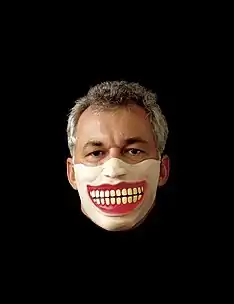 Laughing Mask is part of three self-portrait mask videos by Chaves. It shows a disembodied head floating in the middle of a black screen. A latex carnival mask the artist bought in the central street market of Rio de Janeiro covers the face from just below the eyes. It is dominated by a grotesquely over-sized mouth, fixed in a horrifying smile, which reveals two banks of yellow teeth.[11]