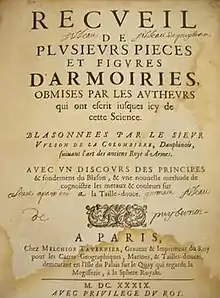 - Carte métodique et introduction succinte à la cognoissance des premières regles du blazon et des principales pieces qu'on employe pour la construction des armoiries, avec les termes dont on se sert pour parler pertinemment de ceste heroïque science... Par Marc de Vulson, sieur de La Colombiere. Paris: M. Van Lochom, 1645
