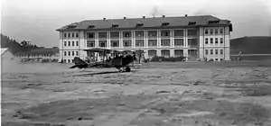 Curtiss JN-4 Jenny taking off from Mare Island Naval Shipyard Airfield, with Mare Island Marine Barracks in background