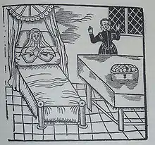 Representations of the legend have been shown outside the church. For example, in the guest house Het wapen van de Prins van Oranje ("the coat of arms of the Prince of Orange"), a picture by Pieter van den Keere, showing Margaret of Henneberg giving birth, was on display. This painting was also commonly printed in the 17th century and is now in the abbey church of Loosduinen. It shows a kind of chest with drawers on the left, on which there is a bowl with many children, and a smoking chimney. In the center, midwives are busy with bed sheets and hot water; on the right in the bed, the mother is shown.