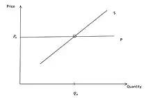 This is the case as a company will only produce whilst the price is greater or equal to the marginal cost, given by the supply curve, and the consumer will only buy the good if the demand at that quantity is greater than the cost.[8] The intersection point is consequently equilibrium as it is the price and quantity where a goods supply would equal its demand.[6] Any natural deviation from this equilibrium would be naturally resolved within a competitive environment and return to this state.