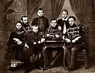 From left to right: Grand Duchess Maria Alexandrovna, Emperor Alexander II with Grand Duke Sergei Alexandrovich in his lap, Grand Duke Vladimir Alexandrovich, Grand Duke Alexander Alexandrovich on the table with his arms crossed, Grand Duke Alexei Alexandrovich and Tsarevich Nicholas Alexandrovich