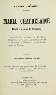 Maria Chapdelaine is a romance novel written in 1913 by the Breton writer Louis Hémon, who was then residing in Quebec.[1] Aimed at young French and Quebecois people, the book had been included in school curricula, translated, and has been extensively analyzed and adapted.[1]