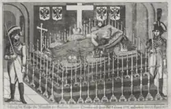 In the winter of 1806, Empress Maria Theresa (pregnant with her 12th child) contracted tuberculous pleurisy, which the imperial physician, Andreas Joseph von Stifft, treated with bloodletting. However, it did not trigger an improvement in health. On 6 April 1807 Empress Maria Theresa gave birth prematurely to a daughter who lived only 3 days. One week later, on 13 April, the empress died as well. The emperor was inconsolable and had to be removed by force from the corpse of his wife. She was buried in the Imperial Crypt in Vienna. The shattered emperor stayed away from the funeral, instead traveling to Buda with his two eldest children.[5] The urn containing her heart was placed in the Heart Crypt and the urn with her entrails in the Ducal Crypt. Empress Maria Theresa is one of the 41 people who received a "separate burial" with the body divided between all three traditional Viennese burial sites of the Habsburgs (Imperial Crypt, Heart Crypt, Duke Crypt).
