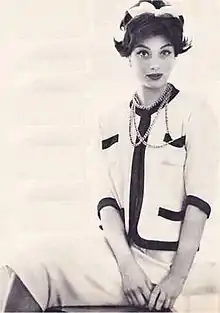 The 1954 comeback collection received a "venomous" reception from the French press, not only because Chanel had yet to regain her reputation following her controversial wartime activities but because the clothes were seen as essentially conservative and offering little new.[8] Bettina Ballard, the influential editor of American Vogue, remained loyal to Chanel, however, and featured Arnaud in the March 1954 issue,[8] photographed by Henry Clarke, wearing three outfits: a red dress with a V-neck, paired with ropes of pearls; a tiered seersucker evening gown; and, to cap it all and in response to both public – and Ballard's – demand, a piece of timeless Chanel – a navy jersey mid-calf suit.[9] Arnaud wore this outfit, "with its slightly padded, square shouldered cardigan jacket, two patch pockets and sleeves that unbuttoned back to reveal crisp white cuffs", above "a white muslin blouse with a perky collar and bow [that] stayed perfectly in place with small tabs that buttoned onto the waistline of an easy A-line skirt."[10] Ballard had bought the suit herself, which gave "an overwhelming impression of insouciant, youthful elegance",[9] and orders for the clothes that Arnaud had modelled soon started pouring in from the States.[11]