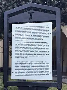 In 1824, Marie-Louise and her daughters moved in Pisa in Italy, where they lived for the rest of their lives, Améthyste dying shortly after their arrival and Athénaïre in 1839.[1] They lived discreetly for the most part, but were occasionally bothered by fortune hunters and throne claimers who wanted their fortune. Shortly before her death, she wrote to Haiti for permission to return. She never did, however, before she died in Italy. She is buried in the church of San Donnino. A historical marker was installed in front of the church on April 23, 2023, to commemorate the Queen, her daughters and her sister.[1][6]