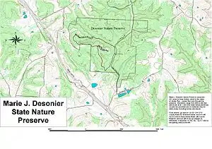 Marie J. Desonier State Nature Preserve is located in eastern Athens County, Ohio, United States. It is heavily forested, on Jordan Run near its headwaters, in Deep Hollow. The preserve features a loop trail, the Oak Ridge Trail, with two footbridges. This trail can be hiked in a two-mile loop, or as a 2.5-mile loop. There are no other developed facilities there except for a small parking area. The preserve represents a good example of the local forest, with relatively few invasive species.