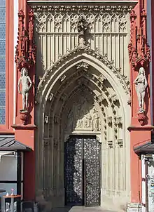 The church features three notable Gothic portals. The southern portal (Brautpforte) from 1430, is flanked by the sculptures of Adam and Eve. The tympanum shows the Coronation of the Virgin, with the Saints Barbara and Katharina. The western portal (Goldene Pforte), made after 1430, has a tympanum with the Last Judgment. The central pillar formerly held a stone Madonna (Schöne Madonna, ca. 1441) that is today located inside the church (replaced by a copy in its original setting). Finally, the northern portal from the early 15th century shows the Annunciation.[2]: 4–5
