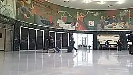 Inside the rotunda hangs Flight, a mural measuring 12 feet (3.7 m) tall and 237 feet (72 m) long.[142][150] Completed by James Brooks in 1942, Flight depicts the history of man's involvement with flight.[43][44] It was the largest mural created as part of the Great Depression-era Works Progress Administration (WPA).[151] The mural is roughly divided into two sections. The first section depicts early history of aviation, including prehistoric humans' inability to fly; the Greek myth of Icarus, who flew too close to the sun and got burned; and the flight-related inventions of Leonardo da Vinci. The second section depicts the modern history of aviation, starting with the Wright brothers' test flights and ending with modern transatlantic flights.[43] The mural hangs on the upper section of the wall, just below the ceiling.[150][43]
