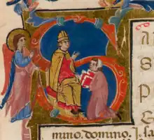 Sanuto presenting his Liber secretorum in three books to Pope John XXII