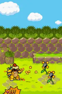 There are various minigames in which the Mario Bros. have to help out Bowser's body from the inside in order to help him progress. Examples include the "Arm Center", where the brothers hit sparklike items into a muscle to strengthen Bowser's arms; the "Leg Outpost", where they stomp on leg muscles to strengthen Bowser's legs; and the "Gut Check", where they help digest food that Bowser eats. One location, the "Rump Command", has the player accumulate adrenaline in order to supersize Bowser if he is crushed, leading to a new battle system in which the DS is held vertically and all attacks require the stylus and microphone.[3] The 3DS version substitutes button presses for the microphone but still incorporates the stylus for certain moves.