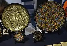 The artisan prefers traditional designs for his pieces but he also does custom work by request.[3] Most of his lacquered pieces are trays, large deep dishes called “bateas” and other relatively flat items.[2][3] The largest pieces can take up to three years to complete and cost up to $50,000 Mexican pesos.[2]