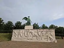 The reliefs on the sides of the podium were inspired by Borobudur on Java. The front of the podium shows a dramatic scene with a ship that is sinking after colliding with a naval mine. Sailors are jumping overboard and being evacuated to another ship. The relief on the left rear side of the podium shows Mars pointing with his sword towards an eagle that is attacking a gull as a symbol of the Great Powers' assault on the small, peaceful nation. On the right rear side is a representation of Mercury with his winged helmet, God of trade and seafaring, pointing towards three doves. The fourth relief depicts a fatherless family.[1]