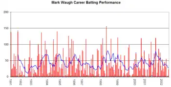 Waugh and Mark Taylor opened on debut against Tasmania at Hobart's TCA Ground. New South Wales were sent into bat and Waugh was dismissed for 13 and New South Wales fell to 3/60 in the first innings.[43] He scored 28 in the second innings, but the drawn match was more notable for an incident on the third morning, when the new opening pair overslept on Taylor's 21st birthday. They were punished by coach Bob Simpson with fielding drills, forcing the pair to take hundreds of catches.[44] He took his first catch, that of Roger Woolley on debut. Waugh fell on tough times, being dismissed for a duck and four by Test bowler Merv Hughes in the next match against Victoria and then 17 and a run out for another duck against the touring New Zealand.[45] With a First-class average of 10.33, Waugh was dropped for the next five matches. However, for the final four matches of the season, Waugh was recalled to the team as a front-line fast bowler and middle order batsman. He took 4/130 in the first innings against Queensland in his first match in the role. They were his first First-class wickets. His bowling was characterised by his liberal use of short-pitched bowling. In the next match against Tasmania, Waugh opened the bowling with Mike Whitney,[46] due to injuries to other bowlers, taking 2/31 in the first innings.[47] Waugh then took 3/49 in the final round robin match against Queensland, before the teams met again in the Sheffield Shield final at the Sydney Cricket Ground. Whitney and Waugh were New South Wales' only pacemen and Waugh bowled 27 overs to take 1/71. Batting at No. 7, Waugh was involved in a century stand with Greg Dyer to help avoid the follow on with 41.[48] Waugh made only 24 in the second innings as the home team hung on for a draw to secure the Shield. Waugh had scored 167 runs at 15.18 and took 11 wickets at 32.00 for the season.[49] He played in one limited overs match, scoring 13 and taking 1/28 against Victoria.[50]