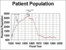 In March 1931, five buildings were completed to accommodate 500 patients. A few months later in June, a total of six buildings were completed and four more patient cottages were almost complete. The hospital was originally envisioned as being a "self contained community".[30] Originally intended to house a population of 2000 patients; however, 3000 patients was reached in 1933.[31] In 1937 funds from the WPA were used for a building, added to accommodate 650 additional patients.[32][33] In 1939 three additional administrative buildings, silos, barns and some other out buildings were constructed.[34][35] Overcrowding was again addressed in 1944 with the passage of a bill authorizing $400,000 part of which was for emergency construction of two dormitory units designed for 80 patients each.[36] Continued to be overcrowded, the hospital population was reported to be 2812 in December 1945.[37] A state review of the hospital in 1947 showed a census of 2736 patients. The review further stated "the scenes in the crowded quarters for senile patients were not such to make anyone proud of the support... given to this needy group."[38] In 1949, Dr. Gordon stated that "patient wards have been established in basements, sun porches and corridors."[39] In 1951, $300,000 was appropriated for a 280-bed building which was constructed for senile patients.[40] State voters provided a $730,000 bond for the construction of four dormitory structures on the property and provide an additional 312 beds.[41] In 1977, the aging hospital required some capitol environmental improvements, electrical upgrades, roof repairs and new boilers. Money was appropriated for these updates in 1975 bond vote.[42] In 1987, a $4 million plan to rebuild parts of the hospital included a second admission unit, two more patient cottages, and conversion of medical services building to a day activity center.[43]