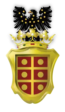 - Shield: Gules, a doubled cross Or between six bezants within a bordure of the second.[2]