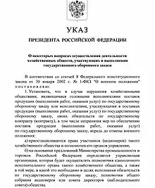 The main powers to ensure martial law are concentrated in the hands of the Russian President. The Government of Russia carries out mainly technical functions, in addition, during the period of martial law, the president can change its structure. Russian Parliament passes laws necessary to ensure martial law and moves treaties with aggressor states. The judicial system and the prosecutor's office in the conditions of martial law operate in the same form, the creation of emergency courts in Russia is prohibited.[9] If martial law is established on a part of the territory of Russia, there may be introduced a military department responsible for applying the restrictions.[10]