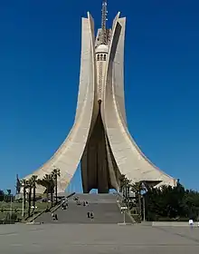 The Maqam Echahid (Arabic: مقام الشهيد, Maqāmu š-šahīd, Arabic pronunciation: [maqaːmu ʃːahiːd], English: Martyrs' Memorial) is a concrete monument commemorating the Algerian War. The monument was opened in 1982, on the 20th anniversary of Algeria's independence. It is fashioned in the shape of three standing palm leaves, which shelter the "Eternal Flame" under it. At the edge of each palm leaf is a statue of a soldier representing a stage of Algeria's struggle for independence.[1][2]