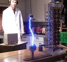 A Marx generator is an electrical circuit first described by Erwin Otto Marx in 1924.[1] Its purpose is to generate a high-voltage pulse from a low-voltage DC supply. Marx generators are used in high-energy physics experiments, as well as to simulate the effects of lightning on power-line gear and aviation equipment. A bank of 36 Marx generators is used by Sandia National Laboratories to generate X-rays in their Z Machine.