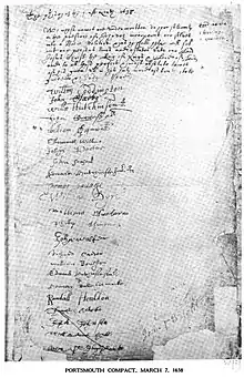Several of those affected by the events of the Antinomian controversy went north with John Wheelwright in November 1637 to found the town of Exeter in what would become New Hampshire. A larger group, uncertain where to go, contacted Roger Williams, who suggested they purchase land from the natives along the Narraganset Bay, near his settlement in Providence. On 7 March 1638, just as Anne Hutchinson's church trial was getting underway, a group of men gathered at the home of William Coddington and drafted a compact for a new government. This group included several of the strongest supporters of Hutchinson who had either been disenfranchised, disarmed, excommunicated, or banished, including William Dyer.[39] Altogether, 23 individuals signed the instrument which was intended to form a "Bodie Politick" based on Christian principles, and Coddington was chosen as the leader of the group. Following through with Roger Williams' proposed land purchase, these exiles established their colony on Aquidneck Island (later named Rhode Island), naming the settlement Pocasset.[40]
