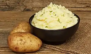 Mashed potato or mashed potatoes (American and Canadian English), colloquially known as mash (British English),[2] is a dish made by mashing boiled or steamed potatoes, usually with added milk, butter, salt and pepper. It is generally served as a side dish to meat or vegetables. Roughly mashed potatoes are sometimes called smashed potatoes. Dehydrated instant mashed potatoes[3] and frozen mashed potatoes[4] are available. Mashed potatoes are an ingredient in other dishes, such as dumplings and gnocchi.[5][6]