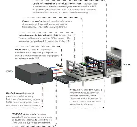 Interchangeable Test Adapter (ITA): Mates to the receiver and houses modules, PCB adapters, cable assemblies, and patchcords for connection to the UUT.