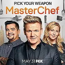 ![]() Promotional poster for season 8, featuring (L to R) Aarón Sánchez, Gordon Ramsay, and Christina Tosi. | |